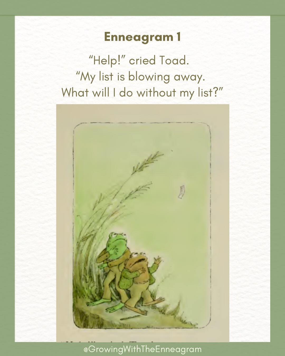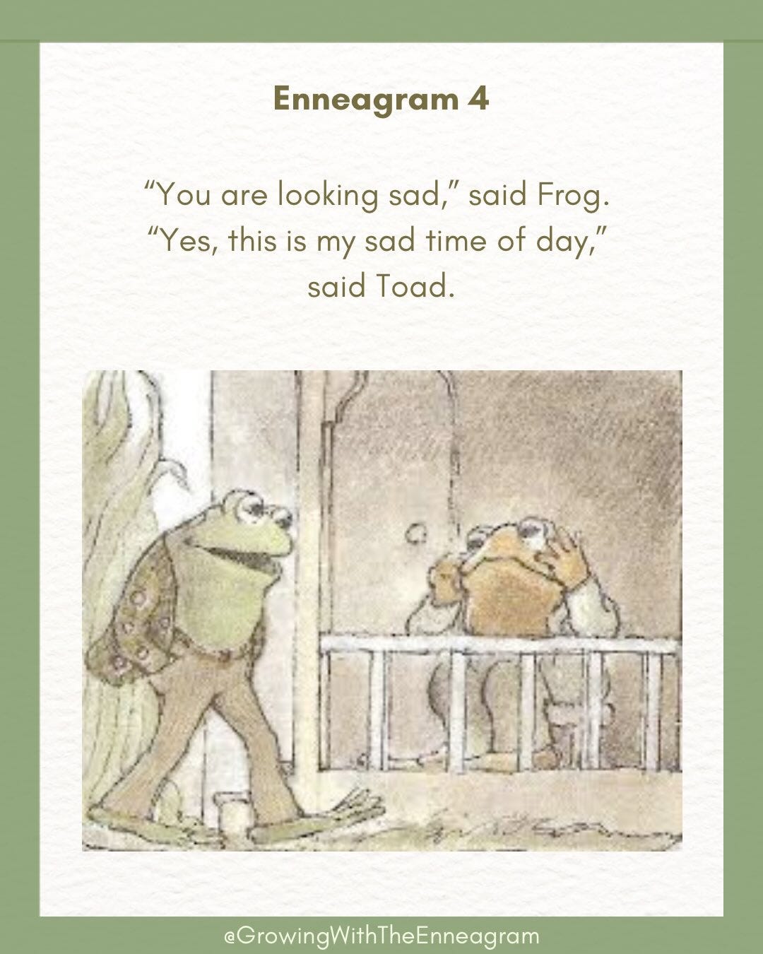 Hi friends! I’m excited to have a collaboration with TJ Teems up over on Instagram today. TJ is a counselor and Enneagram educator, and she does these great Instagram posts where she takes quotes from books, poems, and other sources and plugs them into the nine Enneagram types. One of my favorites is this one from the beloved Frog and Toad children’s books.